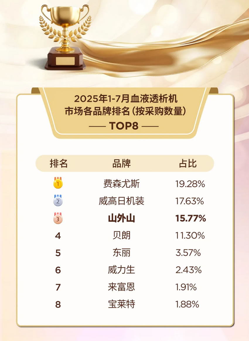 從更長(zhǎng)周期的市場(chǎng)格局來看,2025年1-7月,山外山血液透析機(jī)的市場(chǎng)占比達(dá)15.77%,持續(xù)穩(wěn)居行業(yè)前三,同時(shí)保持著國(guó)產(chǎn)自主品牌第一的領(lǐng)先地位,中長(zhǎng)期競(jìng)爭(zhēng)力穩(wěn)固。